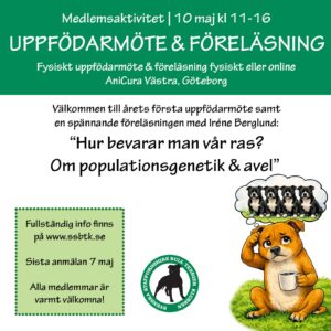 Välkommen till årets första uppfödarmöte samt en spännande föreläsning med Iréne Berglund:Hur bevarar vi vår ras? Om populationsgenetik & avel! Var: Delta fysiskt på AniCura Västra,